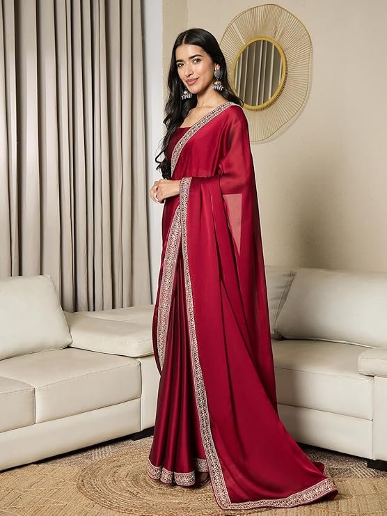 AKHILAM Women’s Satin Solid Ready To Wear one Minute Saree With Unstitched Blouse Piece